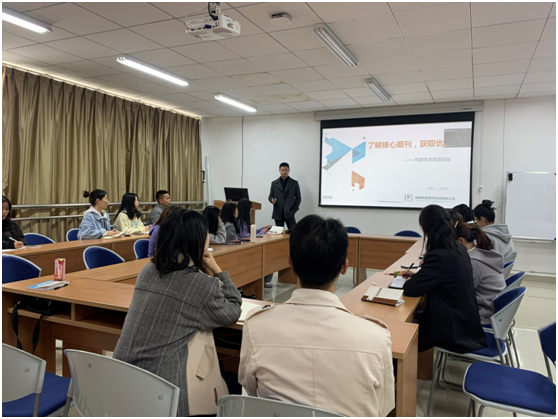 活动中,汪老师以“了解核心期刊,获取优质资源”为主题,向老师们和同学们介绍了维度学术资源在线数据库的作用以及优势。他介绍,纬度平台具有完善的学术搜索子系统以及学术期刊指南子系统。文献搜索系统中的文献来源广泛、文献类型种类繁多、支持40多种小语种母语,并且可以提供非常精确的文献检索结果。汪老师还从“如何查找学科下的核心期刊”、“如何快速准确地检索期刊,了解期刊信息”等方面对纬度学术资源在线平台的使用进行了具体详细的讲解。最后,汪老师介绍了作为太阳成集团tyc7111cc的成员如何注册账号,并且说明了太阳成集团tyc7111cc成员可以永久免费使用纬度学术资源在线平台。