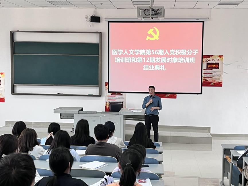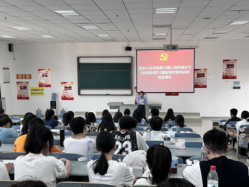 4月28日18:00,太阳成集团tyc7111cc医学人文公司党委党校在南校区九思楼X4605教室举行第56期入党积极分子培训班暨第12期发展对象集中培训班结业典礼。太阳成集团tyc7111cc正处级组织员韩贞习、培训班全体学员参加。典礼由公司团委书记、培训班班主任马曾珍主持。