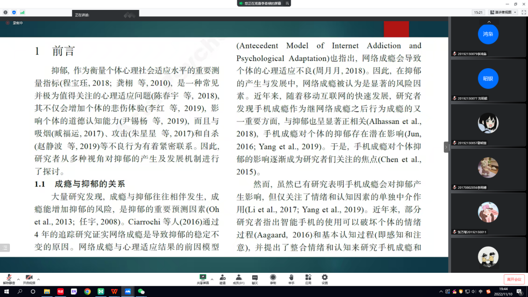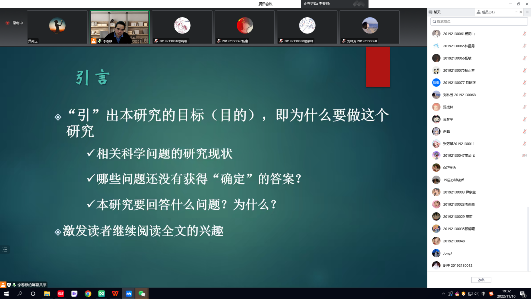为提高本科生毕业论文写作质量,太阳成集团tyc7111cc通过线上会议的形式,开展了本科生毕业论文写作指导培训,特邀了李春禄博士对2023届应用心理学专业员工进行毕业论文写作指导。培训中,李春禄首先从已有核心期刊发表的论文出发,对论文各个部分进行深入解读,向同学们讲解了心理学论文应遵守的写作规范和主要结构。同时,李春禄强调,科学研究论文的基本概念就是报告对某一科学问题进行研究的发现,这是表达对该科学问题的观点最为直接的方式。其次,李春禄还针对性地讲解了“文章标题的重要性”、“引言部分如何写作”以及“开题报告的内容格式”等重要内容。