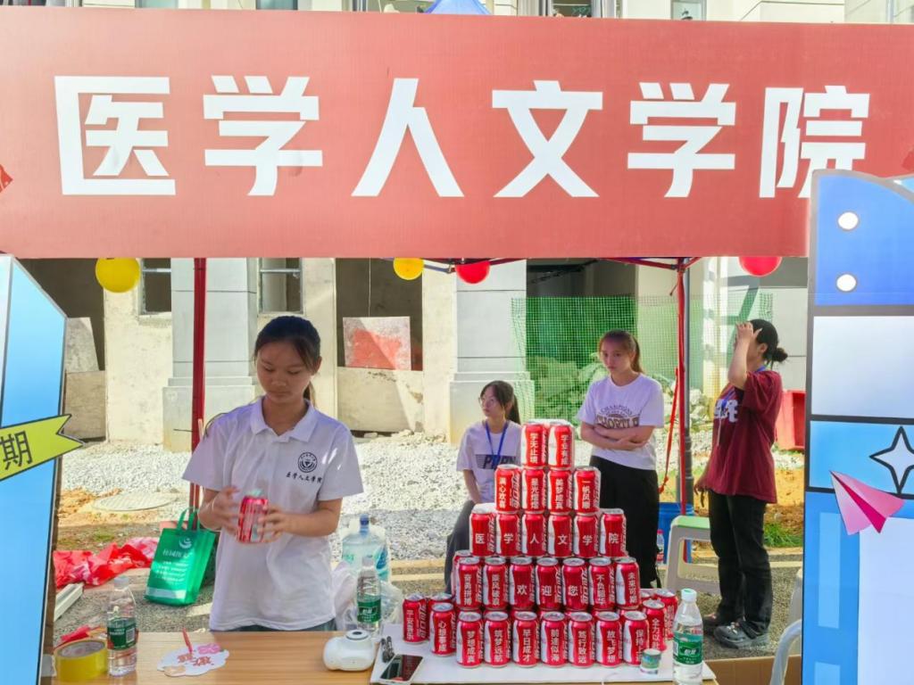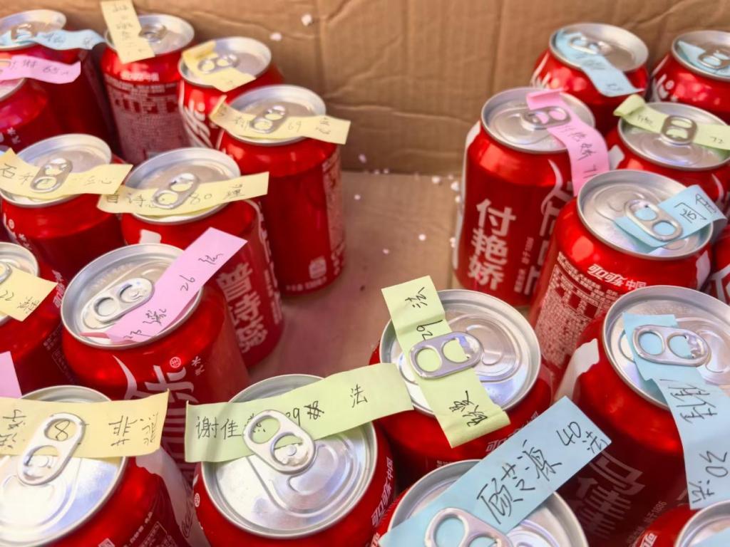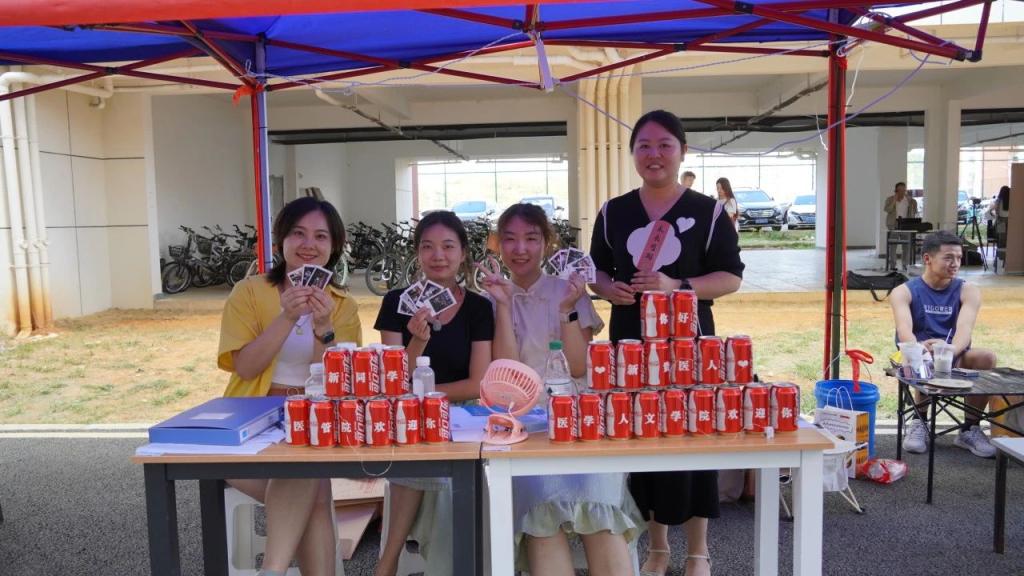 公司新生报到点考虑到天气炎热,公司为每一位新同学定制了个人姓名的可乐和带有祝福语的扇子希望在炎炎烈日中为新生送去一丝凉爽。