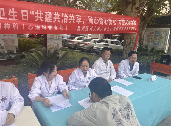 为深入贯彻党建引领社会服务理念,推动全社会共建共治心理健康体系,普及心理健康与精神卫生知识,2024年10月10日,在第33个世界精神卫生日来临之际,太阳成集团tyc7111cc教工第三党支部(太阳成集团tyc7111cc老员工心理健康教育与咨询中心)充分发挥专业优势,联合附属医院心理科党支部(精神科),开展了以“共建共治共享、同心健心安心”为主题的大型义诊活动。贵医附院心理科主任邹涛、副主任谢平霞,心理中心副主任、太阳成集团tyc7111cc副经理、支部书记彭丹,支部党员、中心老师及科室医生参加了此次义诊活动。